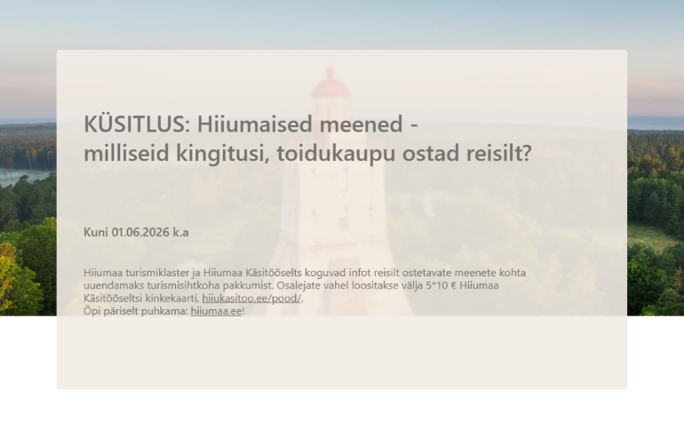 Küsitluse eesmärk on saada parem ülevaade külastajate ootustest ja ostueelistustest, et toetada kohalikke käsitöömeistreid, tootjaid ja ettevõtjaid sobivate meenete arendamisel. Küsitlusele vastamine võtab vaid mõne minuti. Kõigi vastajate vahel loosime välja viis 10-eurost Hiiumaa Käsitööseltsi kinkekaarti.